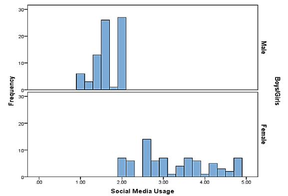 Two independent samples T-test, examined the difference between our stated variables. The findings revealed a significant gender difference concerning social media habits among teenage boys and girls, t (93.900) = -15.063, p ˂ .001, 95% C.I is -5.1867 – 1.39366. The teenage boys are using social media differently (M=1.6474, SD = .31304) than teenage girls (M=3.2526, SD = .87475).