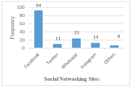 With many other distinct features, Facebook served as a complete source of interest and preferred mostly by teenagers. People use Facebook to communicate with others, and it helps them to build their professional profile; it is an RSS reader for news and an educational platform for all. Many reasons made Facebook the most preferred social networking. From the beginning, Facebook management keeps on bringing significant improvements. These modifications attract their users, and thus people mostly prefer Facebook. Figure 2 contains descriptive statistics for the most frequently use social networking sites. Results revealed that n=94 or 61.8% of respondents considered Facebook as the most preferred SNS. Facebook is mostly preferred for different purposes. Due to available social networking sites on mobile phones, they mainly access their social media accounts by using mobile technology. Teenagers have greater existence online more than they ever have in earlier times. Seven out of ten teens mainly use Facebook. It is because of the bulk of information, education, and communication availability and usefulness (Boyd: 2008).