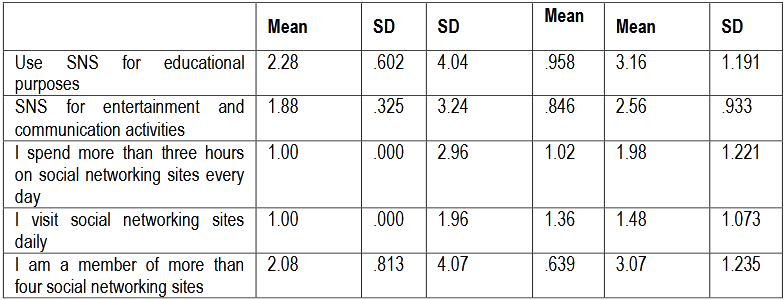 There were statistically significant results, as displayed in Table 1. Of particular note and in support of H1, male participants responded that they use social media for entertainment and communication as compared to girls. Gender is one of the most conspicuous demographic variables and, discrepancies based on gender are also prevalent in social media usage. Similarly, boys and girls have distant patterns of social media usage. Even if they use the same social networking site, their selected content differs from each other.