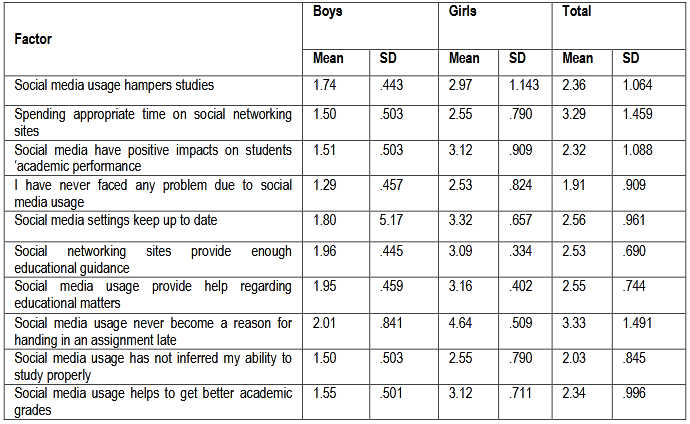 Abstract: Due to the ease of access and technological progression, social networking sites have deeply rooted in our lives. This study scientifically scrutinized gender discrepancies concerning social media usage and its influences on academic performance. Results revealed explicit differences between social media usage among teenage boys and girls. Boys mainly use social media for communication and interaction, while girls use social networking sites for educational purposes. Moreover, results also affirmed a strong positive correlation between social media usage and students’ academic performance. Therefore, the researchers recommended further evaluation of other facets of social media to analyze their usage and its impacts on students’ educational performance.