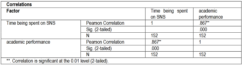 Table 3 shows a strong correlation between the time being spent on social networking sites and academic performance. Therefore, the significance level is 0.01, and the Pearson correlation is .867, which shows a strongly significant relationship between the stated variables. Results of an investigation showed that social media is positively associated with students’ academic performance. They tend to receive information and supplementary material from social networking sites. For this reason, social media usage does not affect students’ academic performance. In this context, n= 122 or 88.2% of participants responded that despite using social media, they are studying properly, and their academic grades do not get influenced. The Internet is an important platform for sharing and learning, conducting an assessment, motivating teamwork, and brainstorm about new ideas as students are well aware of their social media usage. They spend appropriate time on social networking sites, which do not affect their academic performance. It is also suggested that the nature of usage and time management are two factors that determine the positive and negative impacts of social media usage. Additionally, learners use social networking sites for gathering information. Technology can reinforce learning if used appropriately. The negative and positive aspects of social media are purely based on its usage. If used properly, it can bring certain positive outcomes (Aillerie & Mcnicol: 2016, pp. 89- 100).