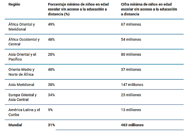 Si consideramos cifras de la UNICEF en agosto de 2020 se estimada que una tercera parte de las personas en edad escolar no tuvieron acceso a la educación, es decir, que unos 463 millones de niños/as y jóvenes no estudiaron en dicho año1. Sin desmedro de lo preocupante de esta situación, es gravísimo constatar que a la región denominada América Latina y el Caribe solo afecta en un 9% el acceso a la educación a distancia (unos 13 millones). Es preocupante porque pareciera ser que esa cifra solo da cuenta de quienes estuvieron matriculados/as en las escuelas sin considerar si esas escuelas hicieron o no clases.