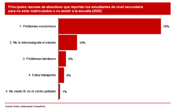 Asociado a esta situación de pandemia por Covid-19 también nos enfrentamos al problema de la deserción escolar que de por sí ya era un problema en las escuelas de la región. Para contextualizar consideremos las cifras de los ministerios de educación de algunos países. En el caso de Chile se proyectó que 81 mil escolares abandonarían el sistema escolar en 20213, totalizando 264 mil personas excluidas de la educación lo que conlleva a problemas judiciales debido a que dicho país tiene obligatoriedad (marco legal) de cursar la educación primaria y secundaria. Del mismo modo, según datos del Minedu en Perú unos 230 mil estudiantes dejaron los estudios en 2020. Esto asociado principalmente a las consecuencias económicas que ha dejado la pandemia mundial. En el gráfico se recoge la información para nivel secundario4.