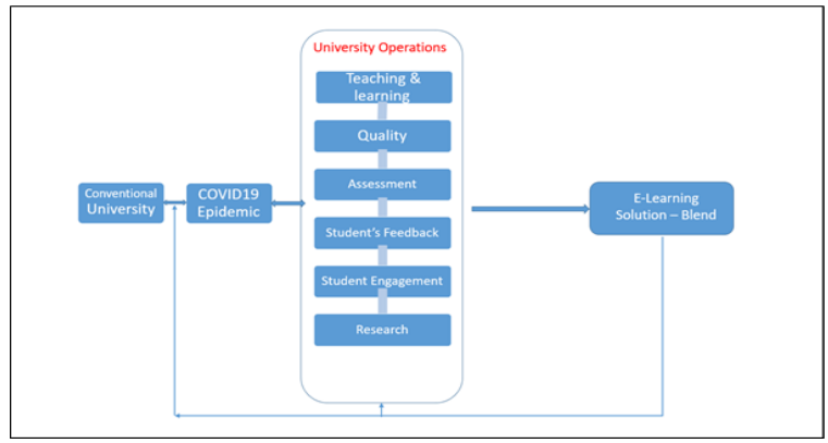 Similar to another corporate sector (Darwish et al., 2020, pp. 1927-1934), universities all over the world also faced issues due to the COVID-19 pandemic. Academic institutions were forced to suspend studies dueto the COVID-19 pandemic outbreak. Universities are committed and should continue to deliver their programs and obligation to their students. This was a sudden, unpredictable occurrence that made the academic leadership and decision-makers act fast to offer a remedy to the situation. E-learning was the Lifejacket thathoped to help universities and students to continue marching on. This problem made universities work hard to meet up with the risks and issues associated with the suspension. For this purpose, the impact of the suspension will be identified as well as the transformation of the delivery, while highlighting the experiences associated with this episode (See Figure 1) using the experience of Kingdom University in Bahrain as a casestudy.
