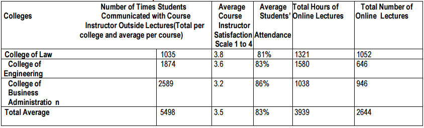 This includes the bulk of the students and the faculty members at Kingdom University. A dashboard was developed on our website showing live updated figures on data relevant to our progress in numbers of lectures and meetings that were achieved online, in addition to links to access student information, registration, online tuition, and support. This demonstrated to stakeholders’ latest developments in our online teaching and learning journey. Table (1) shows a summary of the online teaching profile at KU for the second semester of the academic year 2019-2020. It gives a summary of the number of lectures and hours of online teaching provided and the attendance ratio of the students in individual courses within each college and across the whole university. The average attendance ratio was 83%, which is similar or even higher than in conventional circumstances. The average satisfaction of our faculty members out of 5 was 3.5. Moreover, the satisfaction of students with the online teaching from our instructors’ point of view was 3.5. Although this satisfaction rate is positive (equivalent to 70%), it was still influenced by some resistance from faculty who were not used to modern computer technologies.