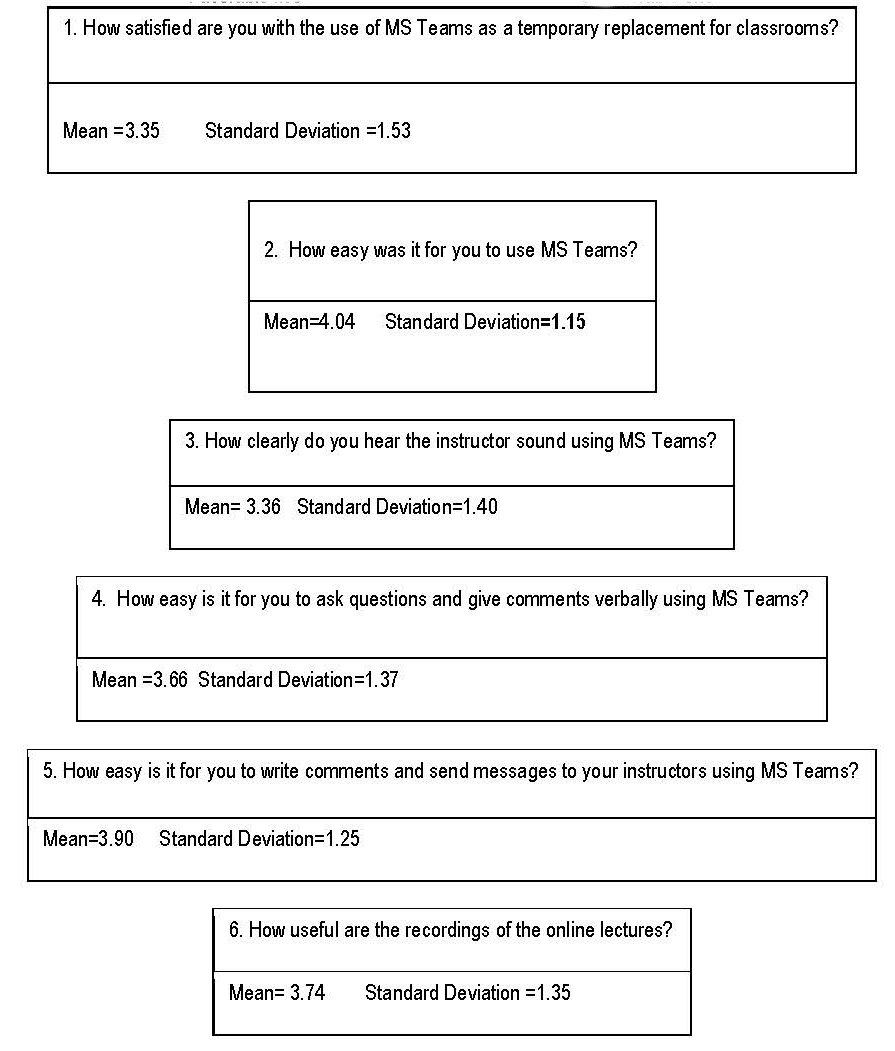 The survey aimed to measure the students’ feedback regarding the transformation to the online model. The degree of satisfaction varies from 3.36 to 4.0 out of 5.0 (67% to 80%). This satisfaction rate is still a positive indication, and some degree of resistance could be attributed to the general mood of depression and the impact of the economic downturn caused by the global lockdown and Covid19 threat, which is notattributed to teaching. It can be concluded that the students generally found it simple to use MS Teams and experienced a satisfactory medium for online lectures and interaction during the lectures. The recordings of the lectures were an additional benefit that was not available in normal classroom lectures. This latter benefit was decided to continue as additional support complementary to teaching after the conventional mode of teaching is resumed when the Covid19 pandemic is over.