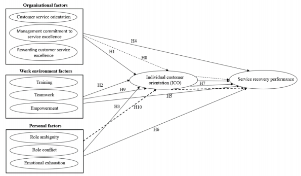 H8: Individual customer orientation mediates the relationship between organizational factors and service recovery performanceH9: Individual customer orientation mediates the relationship between work environment factors and service recovery performanceH10: Individual customer orientation mediates the relationship between personal factors and service recoveryperformance.