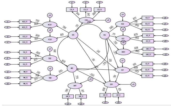 Theremaining 608 analysis samples were used for testing the path model. In the measurement model, the Cronbach’s Alpha coefficient of all constructs is greater than 0.7, which is considered satisfactory internal consistency. One construct that is slightly lower than 0.7 is Teamwork, with 0.685. However, the researchers decided to keep this variable for further analysis.