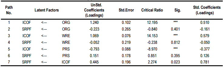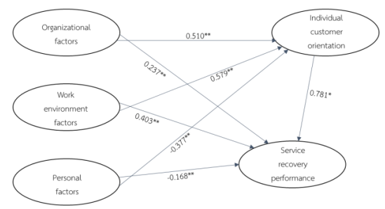 Latent constructs to the dependent variables (service recovery performance, SRPF) are not significant, whereas paths (1, 3 & 5) connecting the three latent constructs to mediator variables (individual customer orientation, ICOF) are significant. In other words, there is no relationship between organizational factors (ORG), work environment factors (WRE), personal factors (PRS), and service recovery performance (SRPF). In a similar vein, there is a significant relationship between organizational factors, work environment factors, personal factors, and mediating variable, individual customer orientation (ICOF). Path 7 connecting the mediator variable (ICOF) to the dependent variable (SRPF) is also significant, which indicated the relationship between individual customer orientation and service recovery performance. The results from SEM indicate a possible mediation effect of individual customer orientation (ICOF) on the relationships between the latent constructs (ORG, WRE, and PRS) modeled as antecedents and dependent variable, service recovery performance (SRP). The model fit indices showed a good fit with Chi-square = 297.282; df = 305; p-value>0.05; GFI = 0.965; CFI = 1.000; TLI = 1.001; PNFI = 0.845; RMSEA = 0.000). These indicated that a modelfits the sample data (Mekhum & Jermsittiparsen: 2019, pp. 176-187).