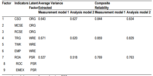 SEM was used to test the path model. Based on the measurement model (model 1) of 250 samples and analysis model (model 2) of 608 samples, three independent variables are modeled as antecedents directly associated with dependent variables. The fit of the path model suggested representing the structural relationships between the three independent variables, and one dependent variable was evaluated via SEM. The overall chi-square goodness-of-fit value were insignificant for model 1 and model 2, χ2 (df = 305, 305) =309.465 and 328.592 respectively, p > .001 for both models, and the incremental fit indices (GFI, TLI, CFI) of two models are above .90. This indicates the model of measurement and analysis data is a good fit when compared to the independence model in that the posited model represented over a 90% improvement in fit over the null or independence model; therefore, supporting the structure of the posited direct path model. The RMSEA value of 0.011 is also with the acceptable range; thus, indicating that the model fits the data well. In addition, the PNFI value was 0.813 and 0.844 which is used for comparing the goodness-of-fit for competing values. The researcher assumed that the dimensions in the measurement model were correct. In order to examine whether the dimensions identified in the analysis model are not different from the measurement model, the comparison of the loadings and model fit indices between the CFA measurement model and CFA analysis model are compared. Table 1 reports the results of CFAs of models 1 and 2. The measurement scales show strong convergent validity. Discriminant validity is achieved when the variance-extracted estimates exceed the squared correlation estimates.