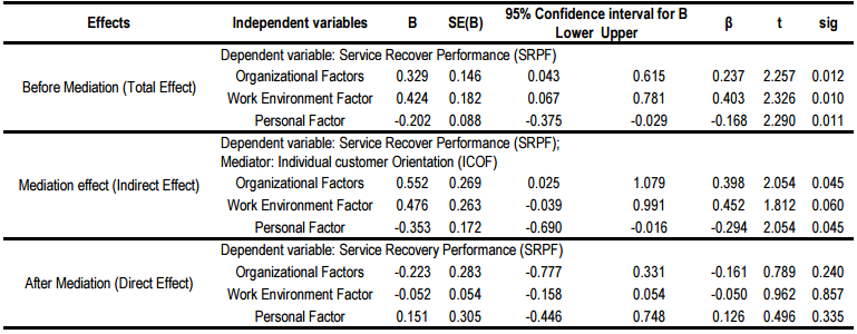 Moreover, the relationship between mediating variable (ICO) and the dependent variable (SRP) is investigated when organizational factors, work environment factors, and personal factors are controlled. Path7 in table 2 indicated a significantly positive relationship between individual customer orientation and service recovery performance, with a standard coefficient at 0.781, p-value < 0.05. This result provided support for H7, suggesting that individual customer orientation is positively related to service recovery performance. Lastly, the relationship between the antecedents and the SRP is analyzed. If the significant relationship is posited, but correlation coefficients become less than the result indicated in the first step, it can be concluded that partial mediation exists. If the relationship becomes insignificant, it’s concluded that a full mediation is shown when mediating is introduced. Table 3 shows the results of mediation effects.