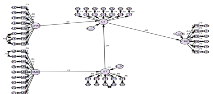 The results of the principal component analysis indicated that all observable variables demonstrated correlation coefficients are greater than 0.4. The results of Standardized Factor Loading of all constructs varied from 0.63 to 0.89, which exceeded the recommended level of 0.4. The exploratory factors of digital marketing communication, CRM, social trust, customer trust, firm performance effectiveness, and customer performance effectiveness accounted for a combined 76.18% of the total variance. The Cronbach's alpha coefficients of digital marketing communication, CRM, customer engagement, social trust, customer trust, firm performance effectiveness, and customer performance effectiveness varied from 0.936 to 0.967, which exceeded the recommended level of 0.7. This section describes the reliability test for the observed variables. The Cronbach’s alpha results from conducting the statistical process are equivalent or higher than the acceptable level of 0.6 to0.7. the Cronbach’s alpha results from previous studies conducted in western countries compared with the results from this study.