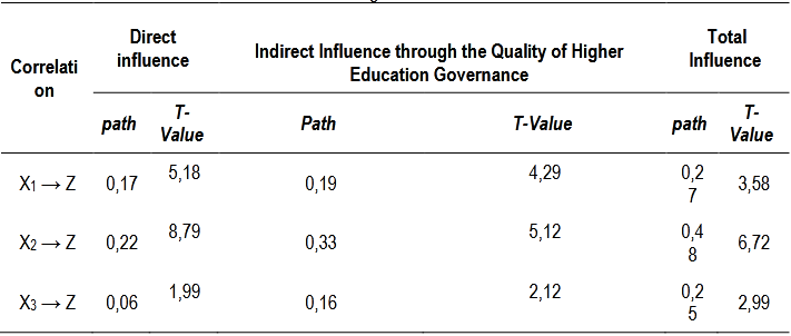 The value of the path coefficient of Information System Implementation Success (X3) on Organizational Performance (Z) through the Quality of Higher Education Governance (Y) is 0.16 in a positive direction. This means that the higher or better the success of Information Technology, which is mediated by the Quality of Higher Education Governance, the Organizational Performance will increase. Judging from the value of the path coefficient, the total effect of the Success of Information System Implementation on Organizational Performance through the Quality of Higher Education Governance is 0.25 higher than the direct effect of the Success of Information System Implementation on Organizational Performance of 0.06. For this reason, it can be concluded that the Success of Information System Implementation is able to improve the Quality of Higher Education Governance on Organizational Performance.