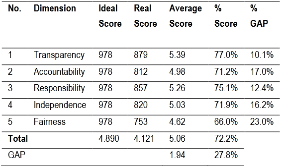 The respondent's assessment of the Quality of University Governance has an average score of 5.06. Based on the average dimensions, the highest rating is in the Transparency dimension, with an average score of 5.39, while the lowest rating is in the Fairness dimension, with an average score of 4.62.