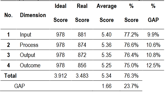 The respondent's assessment of the Performance of Organization has an average score of 5.34. Based on the average dimensions, the highest assessment is in the Input dimension with an average score of 5.40, while the lowest assessment is in the Output dimension with an average score of 5.25.