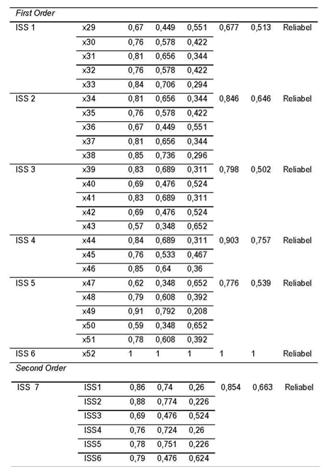 In the second-order test results of the Information System Implementation Successfulness variable, all dimensions have a loading factor above 0.5 so that all dimensions are valid in measuring the Information System Implementation Success variable. Based on the results of the loading factor, it can be seen that the ISS2 dimension has the highest loading factor value so that it is the strongest in reflecting the Information System Implementation Success variable, while the ISS3 dimension has the lowest loading factor value so that this dimension is the weakest dimension in reflecting the Information System Implementation Success variable. For the CR value of 0.854> 0.7 and the VE value of 0.663> 0.5 so that it is reliable. This shows that these dimensions have consistency in measuring the variables of Information Systems Implementation Success.