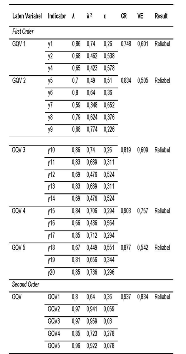 In the second-order test results, the Quality of Higher Education Governance variable, all dimensions have a loading factor above 0.5 so that all dimensions are valid in measuring the Quality of Higher Education Governance variables. Based on the results of the loading factor, it can be seen that the GQV2 dimension has the highest loading factor value compared to other dimensions, so that it is the strongest in reflecting the Quality of Higher Education Governance variables. The CR value is 0.937> 0.7 and the VE value is 0.834>0.5 so it is reliable. This shows that these dimensions have consistency in measuring the Quality of Higher Education Governance variables.
