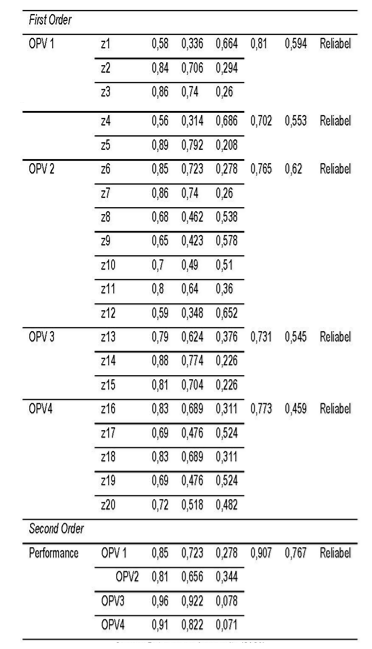 In the second-order test results for the Organizational Performance variable, all dimensions have a loading factor above 0.5 so that all dimensions are valid in measuring the Organizational Performance variable. Based on the results of the loading factor, it can be seen that the OPV3 dimension has the highest loading factor value compared to other dimensions, so that it is strongest in reflecting the Organizational Performance variable. The CR value is 0.907> 0.7 and the VE value is 0.767> 0.5 so it is reliable. This shows that these dimensions have consistency in measuring the Organizational Performance variable.