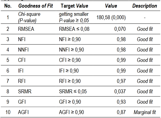 For the full model, SEM testing is carried out with 2 (two) types of testing, namely model suitability, and model hypothesis testing. SEM full model testing is used to see the feasibility of the model or the suitability of the model. Evaluation of the good fit of the structural equation model by comparing the recommended fit index values as presented in Table 8.