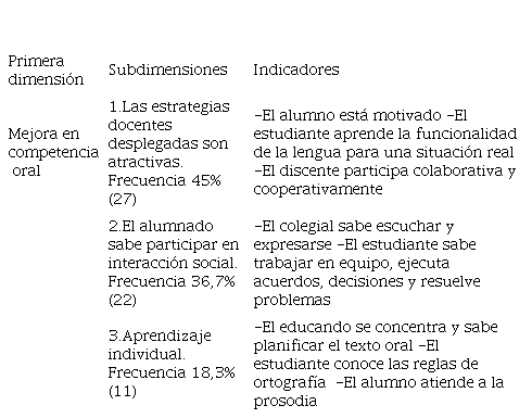 Tal y como se observa en el cuadro 1, en la primera dimensión acerca de la mejora de la competencia oral, emergen tres subdimensiones por este orden de frecuencia. La primera, a través de estrategias docentes atractivas se incentiva al discente sobre situaciones posibles que se puedan poner en práctica. La segunda, el carácter social en el que el estudiante aprende destrezas comunicativas y sociales, así como otras habilidades transversales que implican iniciativa y liderazgo. La tercera, con respecto a la asimilación individual, el alumnado adquiere destrezas de oratoria y ortografía de forma atenta y concentrada.