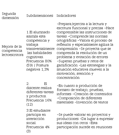 En la segunda dimensión (cuadro 2, arriba) sobre la mejora de la competencia lectoescritora, encontramos tres subdimensiones con posicionamiento positivo según la valoración de la muestra. La primera destaca el trabajo transversal de la preparación a la competencia lectoescritora y las habilidades cognitivas: especialmente en agilizar la comprensión. También a través de las estrategias se subraya la reflexión, así como la motivación en el logro de la atención y la concentración. Se refuerzan positivamente en la superación de retos y pruebas gracias a estrategias de gamificación (como el Escape Room). Se destaca en qué momento se produce: en reuniones. Solamente un participante mostró negatividad en este punto. La segunda subraya la variedad de tareas y productos en la que se ejercita la competencia lectoescritora. La tercera hace referencia otra vez a la interacción social aportando tres elementos: produce una experiencia agradable de aprendizaje, predispone/refuerza a los educandos a la hora de volver a trabajar en equipo y, permite la intención comunicativa de expresar ideas, así como la participación.