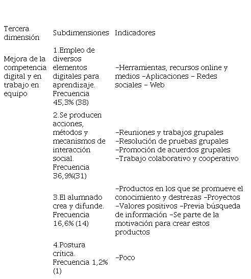 En la tercera dimensión acerca de la mejora que suponen los dos proyectos en relación a la competencia digital y al trabajo en equipo, se destacan cuatro subdimensiones por esta disposición (en el cuadro 3, arriba). La primera recalca con mayor peso cómo el empleo de diferentes componentes digitales contribuye al conocimiento de estos recursos y de los objetivos propuestos. La segunda dimensión subraya la interacción social tanto acciones, metodología y mecanismos de interacción social. La tercera destaca la creatividad de los estudiantes con respecto a productos mediante las estrategias docentes, en este caso mediante proyectos (ABP o PBL Project Based Learning) que requiere un aprendizaje por descubrimiento, valores éticos, habilidades de búsqueda, difusión y a desplegar una actitud positiva. Y en la cuarta, solamente un participante se muestra crítico.