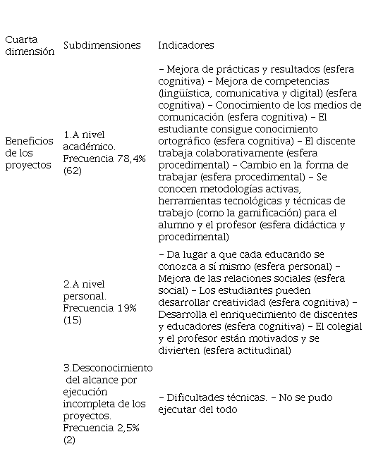 En la cuarta dimensión acerca de los beneficios que los proyectos han supuesto para maestros y educandos (en el cuadro 4, arriba), emergen tres subdimensiones según la valoración, a saber, a nivel académico e individual y desconocimiento del alcance por no haber ejecutado de forma completa los proyectos. En referencia a la condición académica, el estudiante progresa en la esfera cognitiva: avance en competencias (lingüística, comunicativa y digital), progreso de contenidos (ortografía, alfabetización mediática) y mejora académica (resultados, prácticas). Asimismo, se prospera en la esfera procedimental: cambio de metodologías de trabajo, de las que se vuelve a destacar el trabajo colaborativo, herramientas y técnicas. En cuanto a la condición personal se beneficia en cuatro aspectos: autoconocimiento (esfera personal), buena actitud (está motivado), cognición (enriquecimiento y creatividad) y sociabilidad (mejora de relaciones). Dos participantes indican que han llevado a cabo los proyectos de modo incompleto.