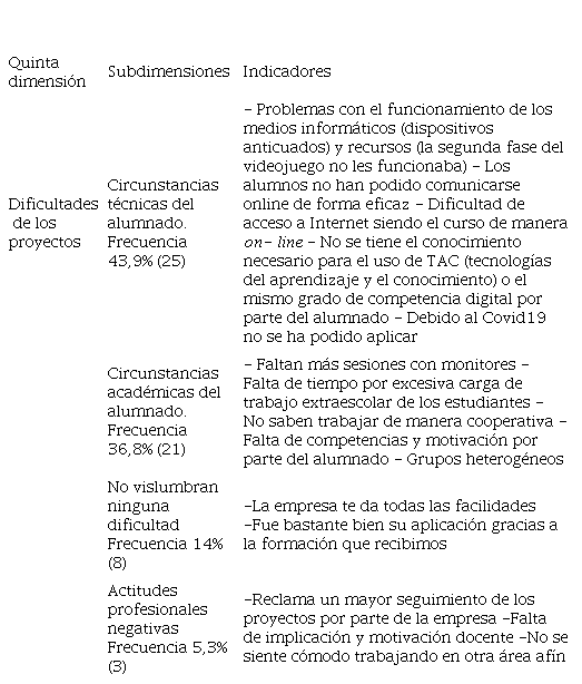 En la quinta dimensión acerca de las dificultades que han encontrado los instructores a la hora de llevar a cabo los proyectos (en el cuadro 5, arriba), han destacado cuatro dimensiones según esta colocación: problemas técnicos y de tipo académico de los educandos. En un grado menor se encuentra por una parte la postura de profesores en la que no vislumbran obstáculos y en otra, las dificultades de tipo actitudinal por parte del profesorado que afectan de forma negativa. En la primera subdimensión es motivo de dificultad el uso técnico-informático, la adaptación a la modalidad online debido al Covid19 y la falta de conocimiento de TAC por parte del alumnado. En la segunda, se resalta la falta de sesiones monitorizadas, la falta de tiempo, no saber trabajar de forma cooperativa y de competencias por parte de los estudiantes. Como factor organizativo se acentúa el hecho de que es un impedimento que sean los grupos heterogéneos. Tercera, hay varios educadores que han manifestado no tener ninguna dificultad por la ayuda que ofrece la empresa. Por último, el factor actitudinal de los profesores destaca en ocasiones por la falta de autonomía, implicación, motivación y adaptación por parte de los docentes en otras áreas afines.