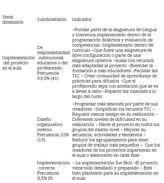 En la sexta dimensión (en el cuadro 6, arriba), referente a cómo se haría más fácil la implementación de los proyectos en el aula, emergen tres subdimensiones por disposición. Primero, plantean sugerencias que se deben a la responsabilidad a la institución educativa y del profesorado que implementa. Segundo, en grado menor recomendaciones con respecto al diseño organizativo interno de los proyectos. Por último, destacan que la implementación fue correcta porque resaltan que fue fácil, además de que el proyecto estaba bien detallado y preparado para implementarlo en el aula.