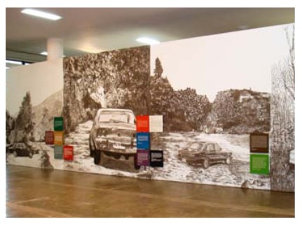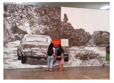 La técnica utilizada en esta obra nos puede servir de forma significativa. El dibujo del paisaje con los automóviles está hecho a carboncillo sobre el muro de la galería, el cual con el paso del tiempo (la duración de la exposición) fue borrándose al ser tocado por el público y la imagen haciéndose más difusa. Esta situación nos plantea dos cuestiones: por un lado, la relación del artista con el simbolismo del paso histórico y su borradura, es decir, su proceso de desaclaración de un momento y su transformación; lo desaparecido, lo borrado por cierta complicidad general. Por otro lado la vinculación con su propio proceso biográfico, el cual invita a la participación de borrar su recuerdo en el sentido del aspecto íntimo personal que pueda caber en la elección del tema y las técnicas de la obra en cuestión. La representación del automóvil sería el símbolo de lo desaparecido y borrado, tanto en su proceso plástico expuesto de borrosidad (a través del paso del tiempo de la exposición), como de la representación del aparato como contenedor móvil que desplaza una posición presencial hacia una posición sin posición: los cuerpos desaparecidos. En este punto tendrían sentido las reflexiones de Déotte en las que el testimonio de quienes no pueden testimoniar quedaría impregnado y acontecido en quienes lo representan y quienes “fabrican” un nuevo acontecimiento a partir del acontecimiento borrado o desaparecido por los testigos sin cuerpo: