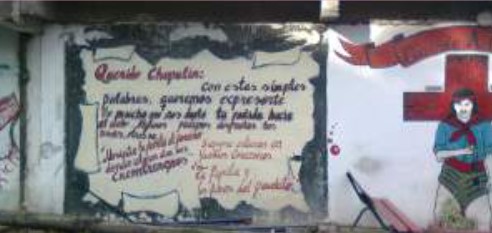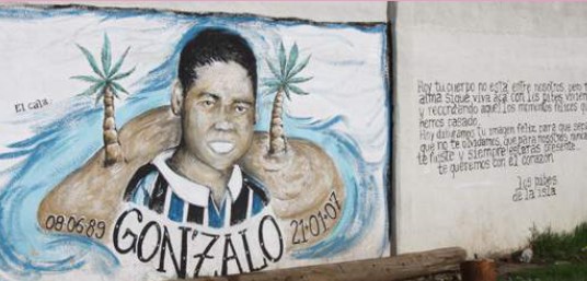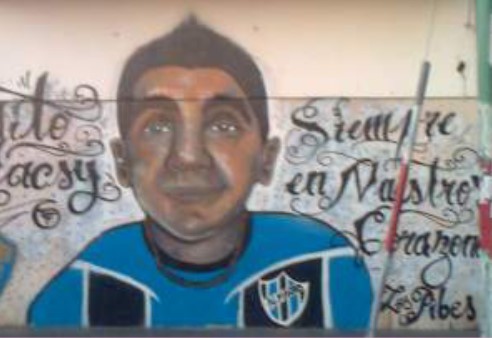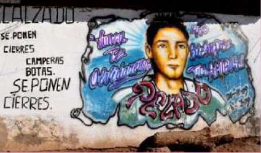 Jimena Vera Psaró (2013).El mural se manifiesta entonces como la presencia de una ausencia pero referida al grupo de pertenencia que elige sacralizar el emplazamiento. Eso significa que el lugar se ha transformado en algo extraordinario a partir de la muerte temprana del compañero, porque pese a que los jóvenes en contextos de vulnerabilidad han naturalizado la violencia (Zaldúa, Botinelli et al., 2009, p. 16), no deja de ser un hecho singular y determinante para su propia biografía la muerte de un par, un amigo, un coetáneo.