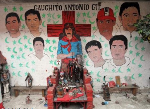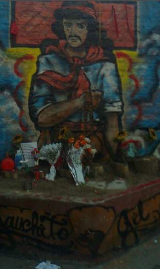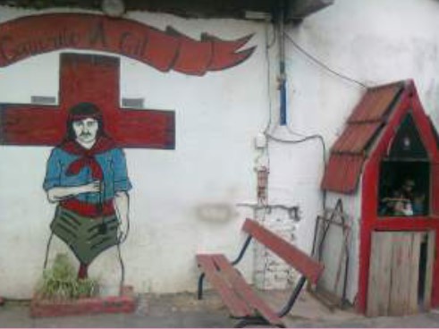 Con la arbitrariedad que implica aislar un tipo de producción cultural para aplicarle la pesada batería conceptual que habita las ciencias sociales, intentamos repensar los murales funerarios como una de las formas posibles del arte popular, por afuera de sus formulaciones clásicas de artesanía o folklore. En esa tarea nos encontramos con un tipo de manifestación compleja, hibrida9 y lindante con otras figuras de la religiosidad popular en Argentina, específicamente con el visible culto al Gauchito Gil o San la Muerte en jóvenes provenientes de sectores populares metropolitanos.