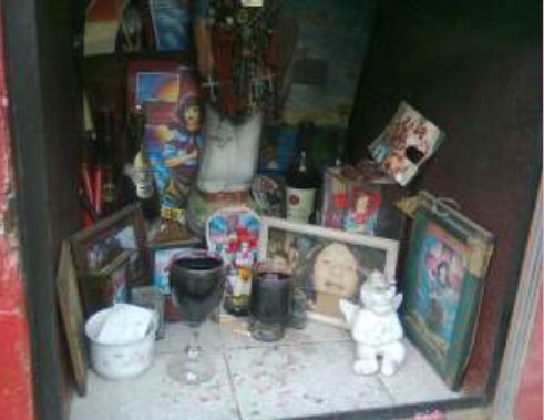 Fotografía del autor.En el 2011, fuimos invitados, por un referente a un barrio periférico de la ciudad de Buenos Aires (barrio Ramón Carrillo) que conocía nuestro interés, a participar de una jornada que organizaban los amigos de un joven fallecido a los días de su muerte en un pequeño terreno interno conocido por todos como “La placita”, en el que solían juntarse cotidianamente. En esa jornada, los jóvenes limpiaron el lugar, armaron un contrapiso en la parte central del terreno, emplazaron dos bancos enfrentados (como clara referencia a espacio de reunión), construyeron una ermita e hicieron un mural. En el mismo pusieron unas palabras en alusión al joven con estilo epistolar5 y realizaron una imagen: la del “Gauchito Gil”. Vale señalar cómo en la referencia a la identidad del joven propia de la ecuación imagen-palabra del dispositivo de visibilidad, la palabra denota la presencia del joven como lo hacía el retrato en otras antes observadas y cómo en lugar del retrato aparecen el “Gauchito Gil” y la ermita. En esta última, como podemos observar en la fotografía, no se ponen solo ofrendas al Gauchito sino al joven, ofreciéndoles cigarrillos, vino y fotos de ellos juntos. Configurando una suerte de simbiosis entre un altar al Gauchito y uno al joven fallecido.