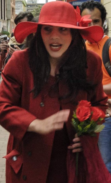 Afuera, en medio del furor de la calle 16, mientras entraban y salían presos esposados, al lado de los juzgados, la artista Elisabeth Garavito tenía instalada una chaza para la distribución gratuita de café negro o el llamado coloquialmente ‘perico’. La acompañaba Santiago Correa, estudiante de arte, quien en esta oportunidad exploró la potencialidad del arte de acción. Vestida de rojo, Carolina Rodríguez deambulaba investida como La loca Margarita. Mientras tanto, Catalina Fernández distribuía el periódico La Mancha Naranja, la marca de Guantánamo que se extiende por el planeta. Previamente, Fernández había conversado con los chazeros del lugar y recogió su voz en el periódico del viernes 11 de julio de 2014. A su alrededor, unos estudiantes de artes tejían el sector, otros mostraban y dialogaban acerca de los iconos contemporáneos más inquietantes, entre estos la Chaza Nacional. En el costado sur de la iglesia La Tercera, un colectivo de estudiantes instaló una serie de iconos contemporáneos. De esta manera respondían a la actualidad, una vez exploraron cómo fue que irrumpió en el arte occidental la estética del ícono (Belting, 2012). Son muchos los participantes en esta última acción para listar sus nombres. Ofrecemos disculpas por no poder hacerlo. Asimismo, un colectivo de la Maestría en Estudios Artísticos realizó una performance que puso a pensar a más de un transeúnte.