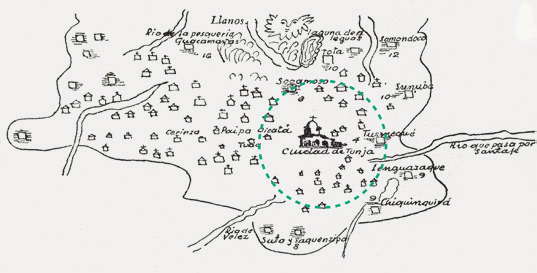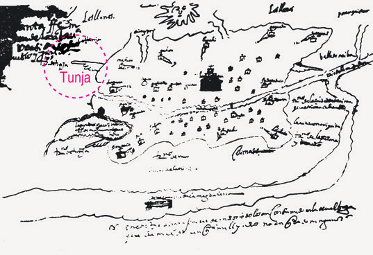 Aunque en esta primera referencia cartográfica que sobre Tunja existe, aparece localizada la ciudad inscrita dentro de un territorio regional, no nos dice nada del trazado urbano, pero si indica un principio de nominación bastante importante, ya que se nombra como ‘Ciudad’, este hecho denota ya un sentido urbano, pues el sitio urbano lo definieron las gestas fundacionales como la ciudad, al respecto Carlos Martínez (1967) dice: