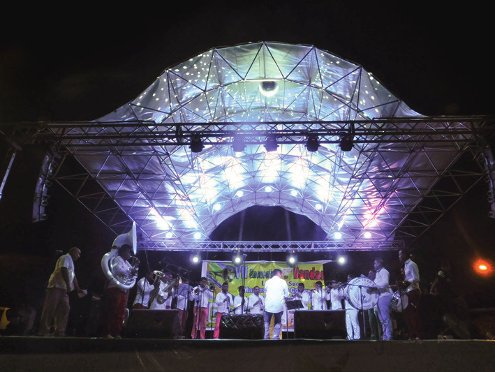 Al preguntar por las razones que hicieron crecer a las bandas, algunos músicos comentan que pueden tener que ver con la necesidad de disputa por el protagonismo cuando las bandas empezaron a enfrentarse a grandes equipos de sonido en eventos en los que se contrapone el fandango a la fiesta de “picó”5. Sin embargo, para otros, el Festival como escenario institucional ayudó a que este formato se agrandara con la solicitud del cumplimiento mínimo de ciertas conformaciones en algunas ocasiones, así como de la permisividad, en otras, de que las bandas se presentaran como quisieran. En esta dinámica, entonces, unas bandas marcaban la iniciativa y otras las seguían, provocando que año tras año el formato llegara a lo que es el estándar en la actualidad.