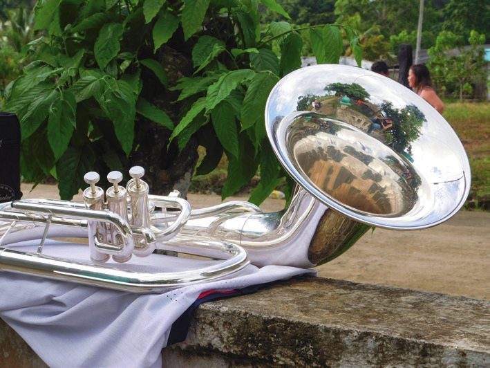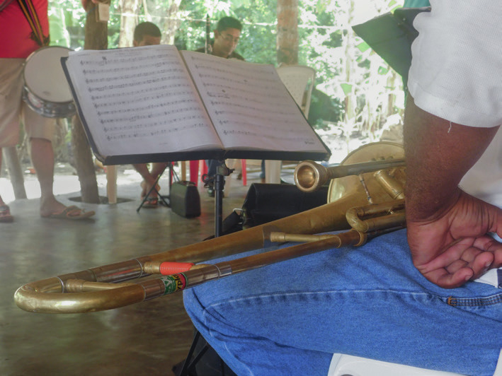 Así, el hecho de que un músico —o, en su caso, una banda— tenga contacto con géneros musicales externos a su sistema es una condición apenas normal e innegable. La distinción está en las maneras y los espacios en los que estas relaciones aparecen en las prácticas de las bandas. Resguardar la autenticidad del porro y limitar las propuestas novedosas a otros géneros musicales interpretados en la banda es la postura de algunos, mientras que entreverar lo local con lo foráneo Bombardino esperando la procesión de la Virgen del Carmen. Puerto Escondido, Córdoba. 2016 evidente es la actitud de otros. Estos últimos, que tienen la posibilidad de arriesgarse y proponer, son casi siempre los que se consideran más competentes por lo que antes llamé profesionalismo. Así, ser capaz de transitar entre el porro y otros géneros, es una virtud que no todos los músicos poseen, y que se ha vuelto un objetivo entre los músicos jóvenes que depositan en la versatilidad su apuesta profesional. Por ello, muchos instrumentistas de bandas buscan insertarse en orquestas de baile —que por demás pagan mejor— por lo que, por ejemplo, algunos clarinetistas aprenden también a tocar saxofón.