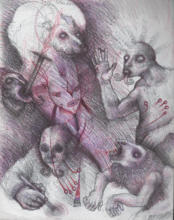 El cuaderno, cuyas narrativas las dividió en diversas rutas, es lo que me permitió el ejercicio de tachadura sobre su caligrafía, realzando aún más la presencia de su traza, pero ejerciendo al igual que él, una apropiación. El nombre de su libreta no podría ser más oportuno para dicho traslado: Una metáfora contada desde lo más profundo de mi ser (2009), y entre caligrafía y caligrafía hacía hincapié sobre las afectaciones orgánicas y sensibles de las obras ajenas. En la misma libreta, el dibujante pastuso Fernando Yela, había realizado un dibujo imitando a mis personajes: un monstruo enmascarado al que al parecer solo le es posible ser una cabeza. Sobre estas prefiguraciones y algunos apuntes de direcciones, teléfonos y palabras, lancé el rostro del amigo dibujante, pensando en su traza, y veía o sentía más bien, que Román al dibujar parecía abrir su vientre con el lápiz como una apertura a lo que era posible solamente por la movilidad de su cuerpo. Jhon Berger siente lo mismo al describir lo que sucede en el cuerpo del dibujante: “los gestos parten de la mano, de la muñeca, del brazo, del hombro, posiblemente también de los músculos del cuello; los trazos que hace en el papel, sin embargo, siguen unas corrientes de energía que no son físicamente suyas y que solo se hacen visibles cuando las dibuja” (Berger: 2011, 20). Con estas afectaciones, estos dispositivos de líneas, configuraciones de anatomías animalescas, lo que intentaba es de-signar este dolor de parto, muy de santo contemporáneo, como apertura a sus animalidades (heridas impropias, cromatismos enrojecidos por el calor de su dibujo, sombras mediadas por presencias y no proyecciones).