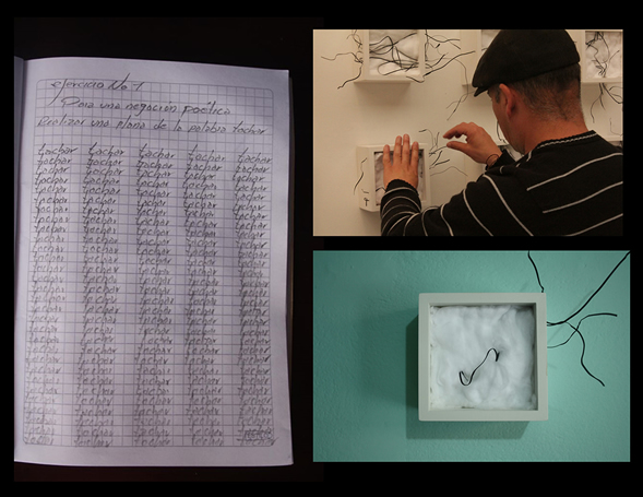 Lapicero sobre papel lino (intervenido anteriormente con caligrafía de Mauricio Genoy y dibujo de Fernando Yela), 2013.Izquierda: Ejercicio No.1 Para una negación poética /Fotografía de cuaderno/Imagen presentada al grupo de dibujo Monstruo Infante /2013. Derecha superior: Imagen de Javier Gómez montando su obra en la exposición Monstruo Infante. Pasto, Centro Cultural Palatino. Abril 17 de 2012. / Derecha inferior: Imagen de una de las 24 piezas de la obra presentada a la exposición Monstruo Infante.