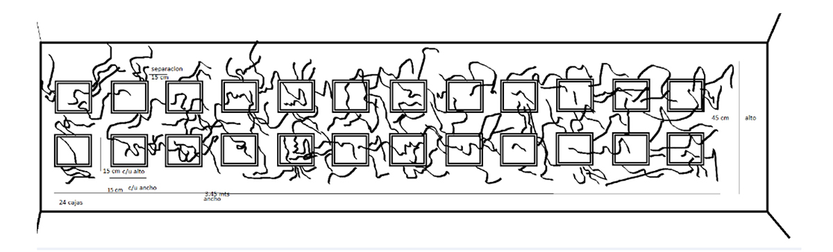 No obstante, hay un carácter artificial en la línea que yace en el dibujo. Artificialidad y domesticación que Javier Gómez dimensiona desde una linealidad dada desde un cable maleable (Imagen 1). En la exposición itinerante Monstruo Infante (2012) dedicada a diferentes perspectivas sobre el dibujo, exhibió una serie de cubos blancos que contenían, a manera de simulación, unas líneas estratégicamente colocadas en algodón. El alambre negro junto a su colchón en blanco daba la sensación de aquellas tareas escolares donde veíamos crecer –tal cual magia– el tronco al frijol después de someterlo a un baño de alcohol. No en vano, Javier, siguiendo esta idea, ha untado formol a las cajas uniformes que se disponen en una cuadricula solamente quebrada por las líneas negras que están dispuestas de acuerdo a un plano de montaje previo (ver figura 2). Ironizando el hecho casi mágico y artificial del crecimiento de la planta, nos acerca a algo oscuro y entrañable: al mal que anida en la traza, como si en el fondo, y pensando en los principios de una generación espontánea, todo puede ser simulado, inclusive la eclosión de vida y la movilidad lineal de lo natural. El formol intenta petrificar en un estado latente a la artificialidad de la línea, no obstante, la movilidad de la línea, su desplazamiento se da inclusive más allá del control del autor-instalador, pues dejó en manos de dibujantes sus posteriores montajes. El cálculo en el dibujo (inclusive cuando esté es asumido desde otros formatos) no es posible, ni mucho menos, desde una matemática cartesiana. Las cajas que se disponían como una categorización de un desván científico, en algunos casos, como tumbas abiertas, se desubicaron, ya no eran parte de la escenificación inicial y terminaron en el suelo (en algunos casos como en la exhibición en Bogotá), o reducidas en tamaño por disposiciones de espacio en Ipiales o Popayán. Las pequeñas tumbas yacen fuera de su lugar inicial, abandonadas, maltratadas por el equívoco dibujante y lo que inicialmente era una escenificación científica de un fenómeno comprobado, terminaron por ser desplazadas a tal punto que esos cubos están en diferentes casas, soportando la acción intempestiva del hogar, a veces sometidas a una disfuncionalidad decorativa. Yacen en demasía por su propia domesticación, y aun así, la línea del dibujo sigue desplazándose hacia la domus en forma de florescencia (desde el plano del montaje, innegable y bello dibujo, ya se anuncia esto). Entonces, ahí donde se intuye una enfermedad o artificialidad del dibujo, se antepone su conjuro a partir del exceso de lo figurativo al realizar un dibujo pensando en su tachadura.