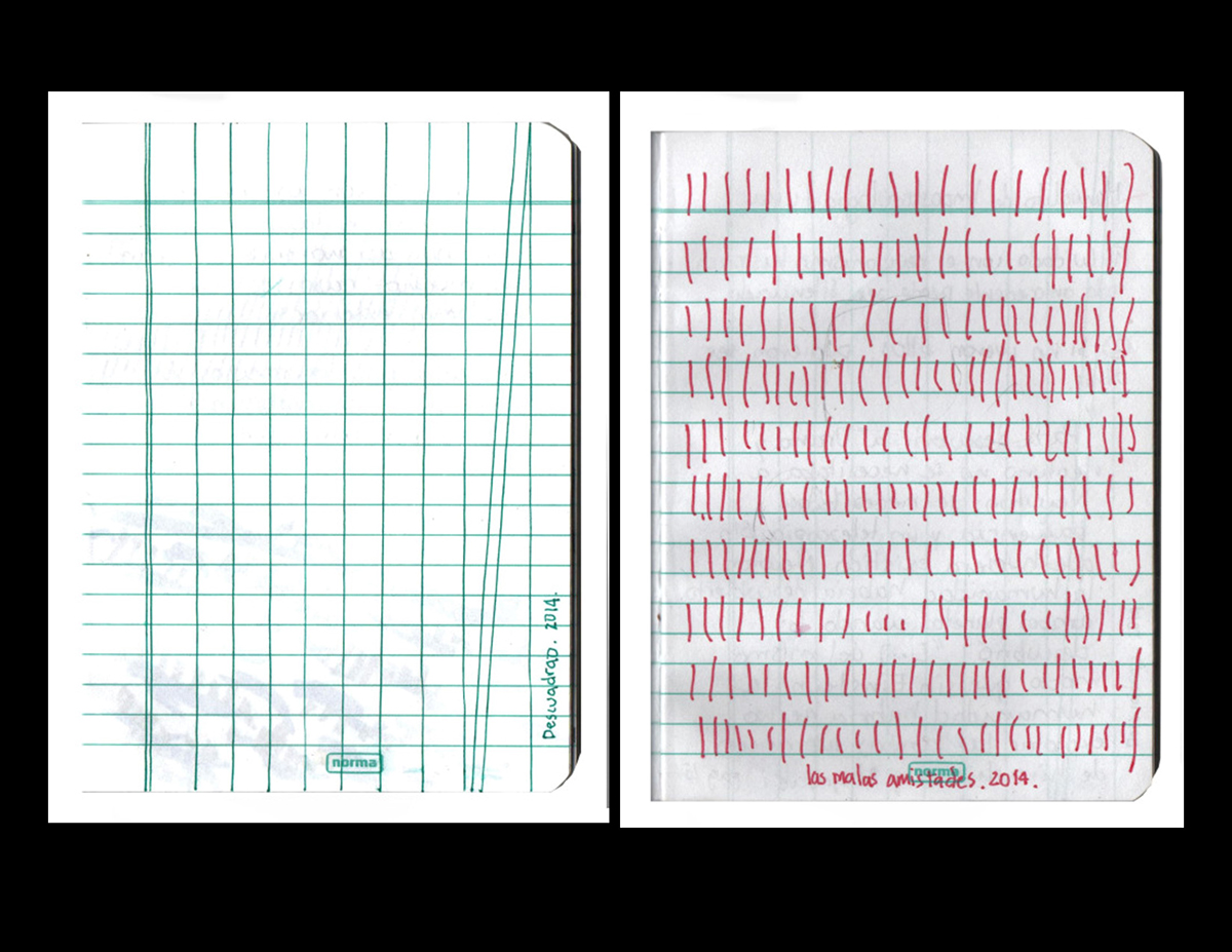 Centro Cultural Palatino- Facultad de Artes (Universidad de Nariño) Pasto, 2012Izq.: Descuadrado. Dibujo sobre formato de cuaderno, 2014/ Der.: Las malas amistades. Dibujo sobre formato de cuaderno, 2014. De la serie Los presto dibujos. Colección de marcas para pasar el rato. 2014.