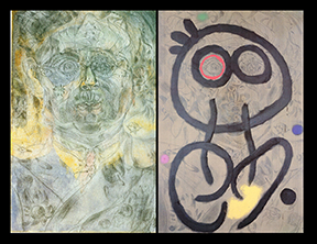 En 1960, Joan Miró (Imagen 4) mandó a copiar un autorretrato realizado en 1937. En esta copia sobrepuso una línea negra como otro rostro sobre su representación anterior, además de unos círculos en colores emblemáticos de su composición visual, que en apariencia maltratan a tal punto la composición anterior que se antepone como una enrostración nueva, para dar comienzo a una serie de diversas composiciones que distan de las primeras ilustraciones y búsquedas del dibujante catalán. Pero, y teniendo presente que es una búsqueda pictográfica, podemos ver la fuerza compositiva de la tachadura como forma de rostro que anticipa cualquier anulación, ejercida desde la academia de arte o desde la ciudad que violenta toda mirada de frente al otro. El rostro del pintor ya no es un elemento identitario ni siquiera de una etapa de construcción estética pues al ser tachado por otra gestualidad más gruesa, más directa, digamos menos ilustrativa, hace aparecer el rostrum, filón y filo de bestialidad en la traza.