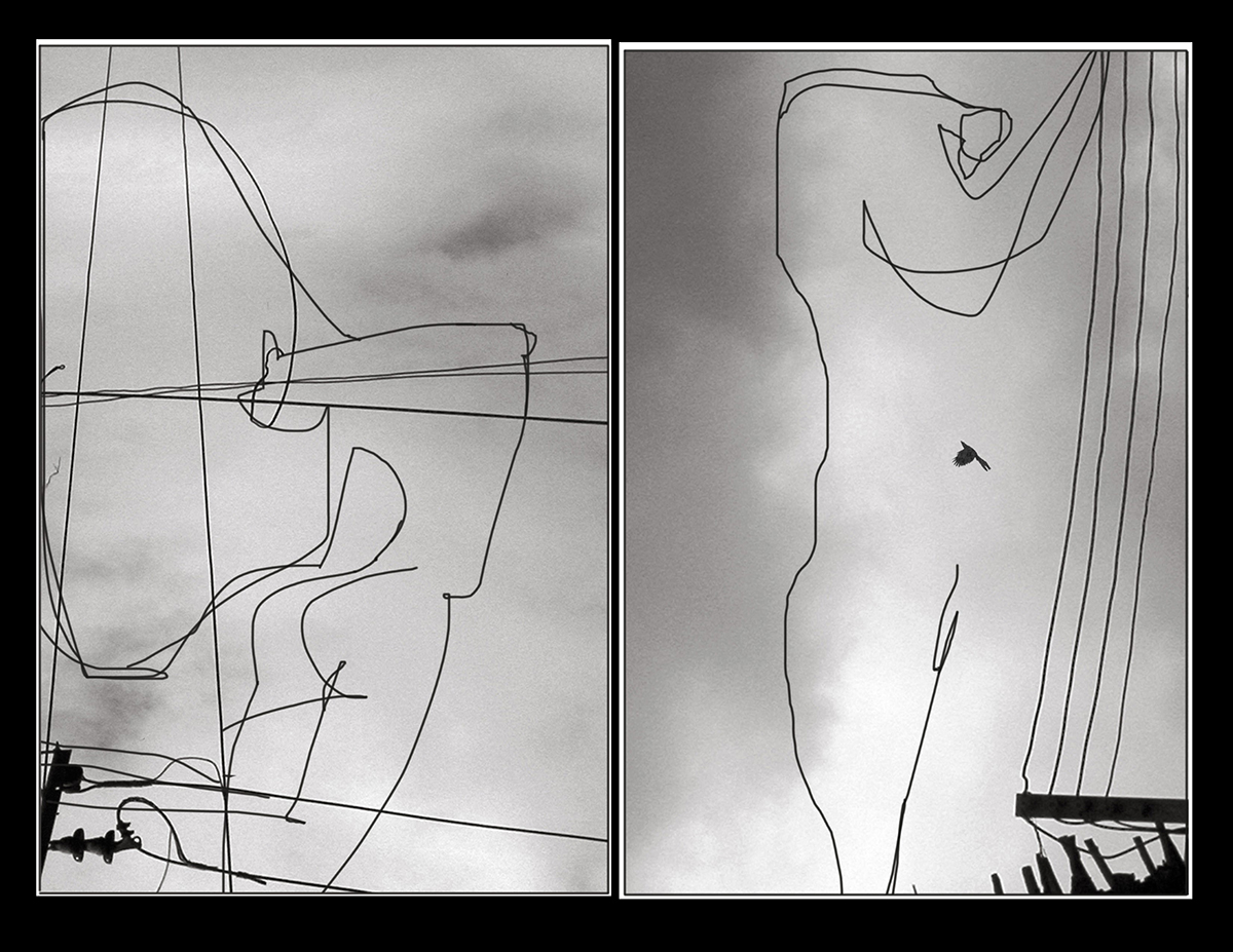 Imágenes extraídas del libro Miró de Walter Erber (Erber, 1992, pág. 85 y 139)Así mismo, se pueden entender las composiciones realizadas por el artista visual Adrián Montenegro (figura 5). Al alterar la disposición de los cables eléctricos desparramados por la ciudad de Pasto, les da otra naturaleza: la pictografía de un cuerpo naciente, pues la artificialidad también provoca la vida y es con el dibujo, al menos con la alteración de la linealidad del cableado, que se puede sentir esto. Y estas líneas que a ojos de urbanista son molestas, se tuercen a favor de una corporeidad que está ahí, latente en ellos. Inclusive formando una simpatía animalesca con los seres: un pájaro forma el ombligo de estas figuras levemente soportadas por el fondo grisáceo de las nubes pastusas. Entonces, la línea-cable es a la vez su propia figuración, una torsión que favorece la aparición del otro, inclusive como formas de acumulación de pelo en esta corporeidad artificial del cable eléctrico. Pero no es un ejercicio neumático, como quiere llamarse al insuflar de espíritu al cableado visiblemente expuesto en las calles pastusas (pues en estos dibujos los cables lo siguen siendo) sino sugerir la aparición de lo otro. En esta inversión de la imagen de lo artificial, se cuestiona su permanencia en la ciudad pues no se prefigura la petrificación de la imagen, digamos fragiliza la linealidad al acrecentar la artificialidad de la línea, entendiendo que hay algo en la línea que impulsa a su animalidad y lo hace a partir del otro debido a que es el dibujante quien se permite este juego inclusive desde la disposición de la alteración digital de lo fotográfico. Entonces, el dibujo no prevé la domesticación de lo lineal ni su aparición; es por eso que siempre apela a otro dibujo, tachadura y desplazamiento que sucede a veces a manos de otro dibujante.