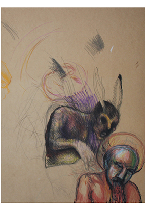 En cambio, Bernal sin previo permiso, con la sutil violencia de quien se ve atraído por una imagen, encima del personaje que había sugerido el dibujo, ha ejercido su tachadura en y con este rostro (el cual habría de sugerirle tiempo después que era San Lucas, el santo pintor). Sendas trazas de grasa –la corrosiva manera en que el óleo pastel atraviesa el soporte a manera de líneas carnosas– diseñan el otro rostro tachando el anterior, pero también, alzando otro rostro que se evidencia en este otro dibujo. Entre estos tonos de carne (reflejos azules y naranjas) una línea negra de marcador sugiere una carga que se acentúa en el rostro a partir de un continuum lineal que va desde el cuello, atraviesa las fosas nasales, las órbitas, el entrecejo, todo el contorno de la cara para acentuar el vómito que sale del personaje. Y lo que en principio quería sugerir como el tacto de lo otro por una especie de ángel animal con cabeza de conejo –derrière de la otredad que viene de lejos– Bernal lo ha acentuado sobre una bestialidad que está precisamente en el rostro marcado de este Santo. Por un lado, persistencias de rostrocidad a las que los dibujantes suelen recurrir al asumir la ilustración de la ciudad, y que, en mi caso, son permeados por la animalidad que atraviesa lo urbano y en el caso de Bernal, por la santidad de lo bestial que se acrecienta por las líneas negras que soportan el peso de la mirada, la risa, la gestualidad de dolor y la carne. Por otro lado, tachadura como para prescindir de identificaciones del autor, pues al asumir la tacha es a otra voz que se sigue, a otro ritmo, pues no es la violencia eficaz del dictamen del otro, es que el cuerpo dislocado del dibujante es a la vez su propia voz y dibujo de esta violentación diaria.