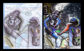 La tachadura es un desplazamiento que se hace en el dibujo propio y no propio. No existen correcciones ni realces, físicamente expone el espaciamiento de las líneas, la movilidad del ductus “ese trazo idiomático por el cual se reconoce un dibujante incluso antes de que firme con su nombre”(Derrida, 2001, p. 205) y la fragilidad de lo anatómico frente a la letra; en algunos casos, evidencia el carácter nocturnal de una experiencia que se realiza a diario. Es así que el dibujante pastuso Andrés Ocaña haría tachadura con varios dibujos míos (Imagen 7). Siguiendo otro camino, digamos respondiendo a otra violencia gráfica, también expondría la desnudez de mi traza a partir de sendas líneas, colores, brumas y tonalidades que acrecientan la crudeza de mi dibujo. Partiendo de un ejercicio planteado para diseminar el autor a partir de un texto poético, los dibujos son abordados pensando en la tachadura de los mismo inclusive realzando la bestialidad del instante que suele aparecer en los apuntes del cuaderno del dibujante. Los cuerpos que en principio constituyen un juego compositivo sustentado en diagonales y cruce de tramas (el cuaderno por sus características de apunte no permite más que una distribución anatómica dada por los vértices y diagonales) son atravesados por la tachadura digital de Ocaña. Sea pensada desde la intervención quirúrgica del espacio por la máquina o por la introducción de letras-seres, lo que vemos es un inverso positivo de mi dibujo y a la vez su envés nocturno (ha nombrado a este dibujo con el nombre sugestivo de “El otro es un concepto demasiado abstracto”). Entonces, tachar también le permite presentar la doble imagen, trayendo y retrotrayendo hacia un cromatismo nocturnal, la línea abierta. Los recorridos de dicha intervención, no solo se conforman con la anatomía de los personajes, sino de los espacios e, igual como le sucede a Joan Miró con sus apropiaciones de los cuadros holandeses (por ejemplo la obra Interior Holandés de 1928 basada en el Tañedor de Laúd de Hendrick Martensz Sorgh (Erber, 1992, pp. 50 y 51), hace aparecer seres que anidan, parasitan, se acurrucan entre los espacios del dibujo. Para luego, exponer-se como dibujante en la temporalidad y suspensión de la eficacia gráfica. Entonces, la tachadura desplaza inclusive la idea inicial de intervención e ilustración, pues el poema ha sido diseminado en forma de grafías equívocas (pese a que Ocaña insiste en el dibujo como acción inequívoca). El dibujo conserva –a manera de vestigio fecundo– una traza antigua (cruda si se quiere) desprovista de ritual, en el borde de lo inhumano, pero que se hace obra en sí del lado de la historicidad del arte; no obstante, no remite a ningún autor de forma inmediata, se sostiene por fuerzas de resistencia e irrepetibilidad. Pues, como asevera Blanchot: “La obra de arte no remite inmediatamente a alguien que la habría hecho. Cuando ignoramos todo de las circunstancias que la han preparado, de la historia de su creación y hasta el nombre de quien la hizo posible, entonces la obra se acerca a sí misma” (1992, p. 209). Ocaña habría previsto esto, al seguir de cerca la forma como se aglutinan las líneas de mi dibujo. No obstante, se puede simular su reproducción a partir de las máquinas reproductivas (scanner y fotografía en este caso) las cuales abren los espacios interlineales que sostienen la supuesta originalidad del dibujante.