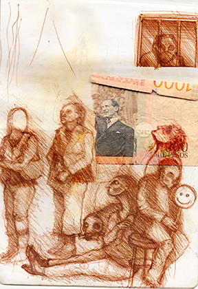 Der.: Andrés Ocaña, intervención digital. El otro es un concepto demasiado abstracto, De la serie Intermedio Civilización Iluminada/2013Dibujo sobre papel (libreta dada como suvenir de banco)