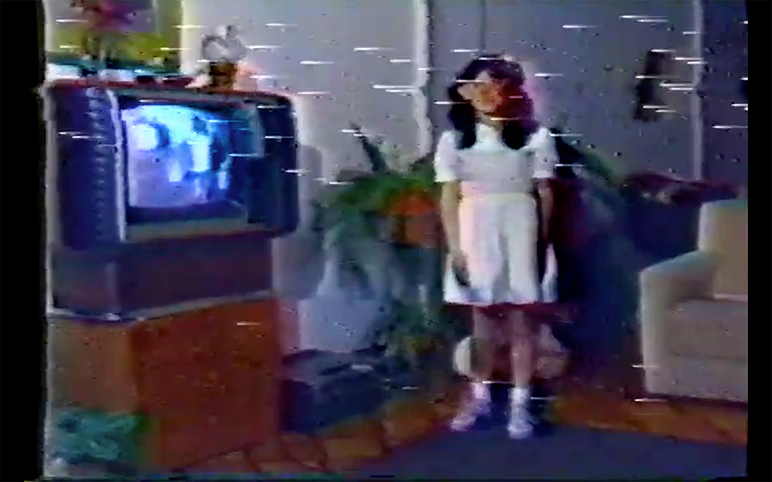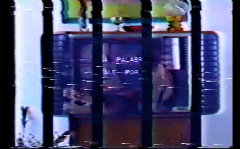La tercera parte abre con una secuencia cargada de ironía y humor. Comienza con una toma de la ‘niña B’ como televidente que elige los contenidos. Ella sostiene en su mano un casete de betamax y se dirige a la cámara mientras dice “este es un poquito de videoarte colombiano”. Luego hay un medio primer plano del televisor. Sobre su pantalla, y mediante el uso de disolvencia, se ha sobrepuesto el cabezote de un video hecho por Charalambos y Édgar Acevedo en 1984. Mientras el video se reproduce ‘dentro’ de la pantalla, el uso del wipe permite que emerjan cuatro franjas negras verticales como si el televisor y el video quedaran encerrados detrás de una reja (Imagen 5).