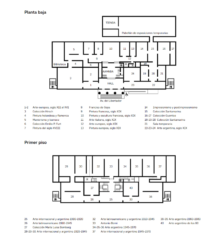 Imagen 1. Plano actual del museo (obtenido de https://www.bellasartes.gob.ar/museo/edificio)En resumidas cuentas, el museo fija la idea de que el arte americano-argentino no está delimitado por el territorio, sino por la historia de la conquista. La institución se desentiende, en sus primeros 50 años de formación, de las producciones americanas, y, cuando las incluye, fija una relativa data de génesis precisa- mente concordante con el inicio de la Nación, a principios del S. XIX. Nótese, por ejemplo, que la exposición La pintura y la escultura argentinas de este siglo remarca incluso desde su título el límite decimonónico, límite que no es tal para el resto de las colecciones del museo, como si de Europa pudieran mostrarse producciones incluso del S. XII, pero lo americano meritorio de ser exhibido datara recién del 1800. Justamente a partir de ese entonces el museo comenzó a entablar un vínculo con Europa por medio de sus estudiantes de arte a la manera de un discípulo aplicado, dispuesto a olvidar lo necesario y a aprender los conocimientos de sus maestros. Las y los artistas argentinos recorrían en su formación los pasos de las diversas escuelas europeas y según la tradición, los estudiantes más valorados eran premiados con un viaje a Europa como una suerte de culminación de los estudios con nada menos que “los verdaderos maestros”.