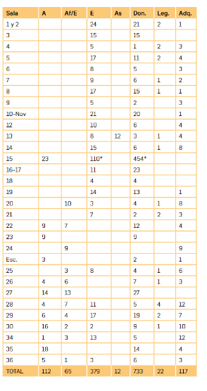 Imagen 1. Plano actual del museo (obtenido de https://www.bellasartes.gob.ar/museo/edificio)Cantidad de obras exhibidas actualmente (otoño-2018) en las salas permanentes del museo, clasificadas por lugar de procedencia (E: Europa, A: América, As: Asia) y modo de ingreso al patrimonio (Don: Donación, Leg: Legado, Adq: Adquisición).Nota: En la sala N.º 15, correspondiente a la donación Guerrico, no se contabilizan en tabla, en la clasificación por origen, las 323 piezas exhibidas en vitrina, por no contar con mayor información que su número de inventario. Sí se tienen en cuenta en la casilla de Donación.