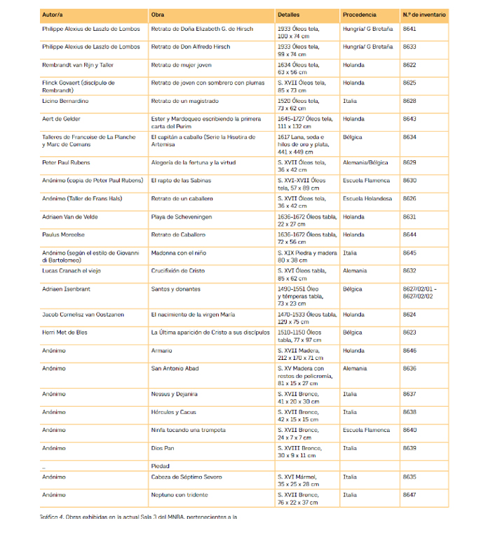 Obras exhibidas en la actual Sala 3 del MNBA, pertenecientes a la Colección Hirsch, por orden de aparición en sentido horario desde el intgreso, primero en las paredes y luego las del centro, siguiendo una espiral y según los datos en sala.
